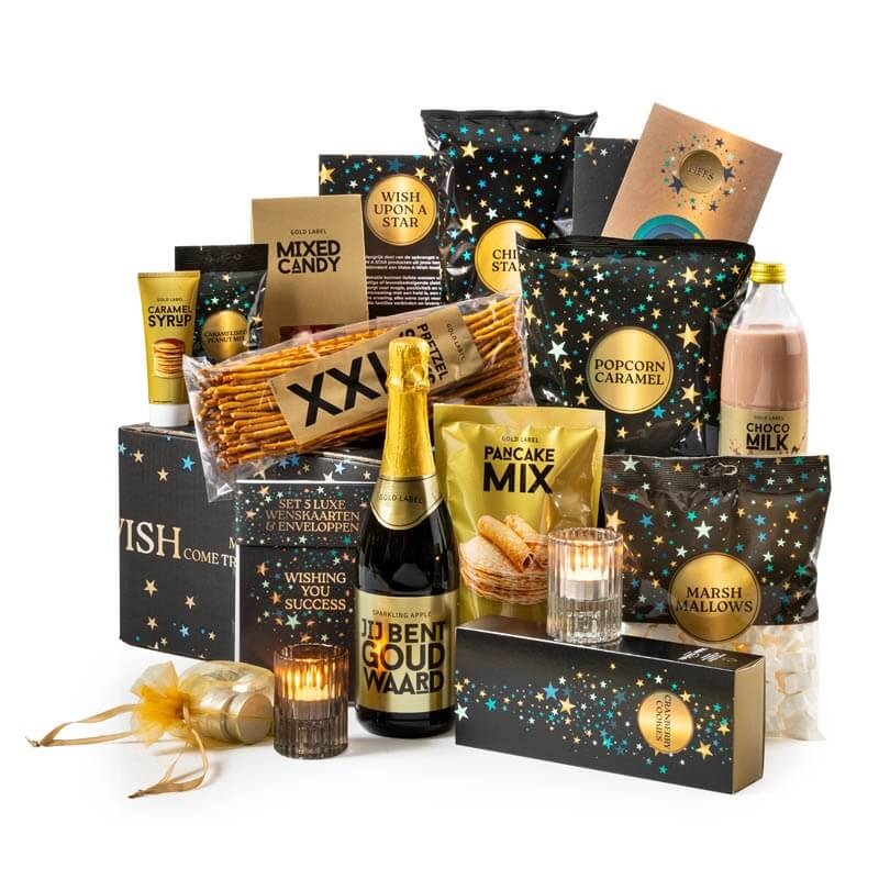 Een bijzonder en stijlvol kerstpakket met een feestelijke sterrenprint op diverse producten. Ze verwijzen je naar de stichting Make-A-Wish Nederland. Deze stichting heeft als missie om kinderen tussen 3 en 18 jaar met een ernstige, soms zelfs levensbedreigende ziekte, veerkracht en vertrouwen te geven door hun liefste wens te vervullen. Maak van deze kerst een wens die uitkomt. Een belangrijk deel van de opbrengst van de product Wish with a Star gaat naar Make-A-Wish Nederland.
