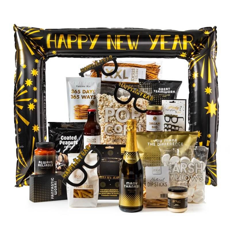 Een veelzijdig kerstpakket voor de hele familie met een moderne, motiverende uitstraling. Ideaal voor medewerkers of relaties die je wilt bedanken én inspireren voor het nieuwe jaar. Het is gemaakt in de wit, zwart en gouden tinten, leuk om te geven en perfect voor oud & nieuw dankzij het Happy New Year opblaasbare photo frame.
