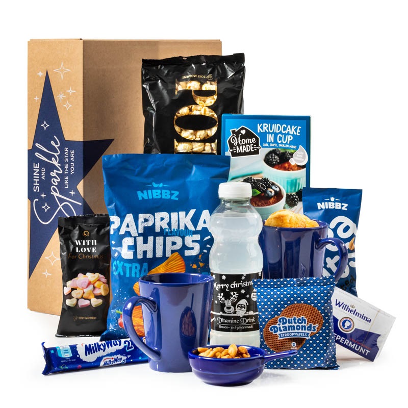 Fris, fun en feestelijk! Cake in een mok, heel makkelijk te maken en erg lekker. Met deze twee blauwe mokken, zoete verrassingen zoals stroopwafels en Milky Way en knapperige snacks zoals chips en pinda’s is dit kerstpakket perfect voor een ontspannen moment in de feestdagen. Fris, fun en feestelijk dus! Voor ieder wat wils.