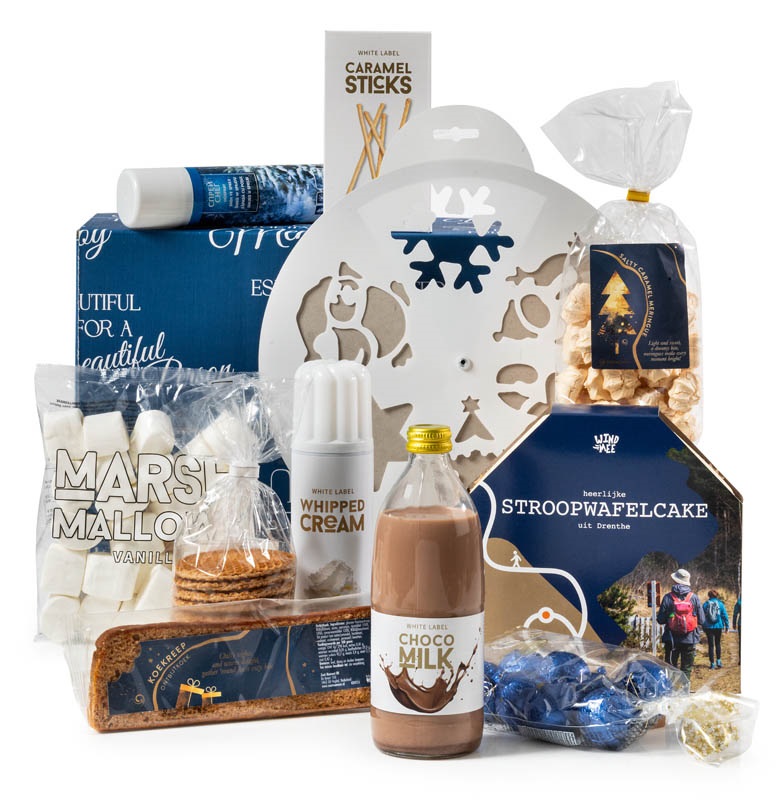 Lekker winters en typisch Hollands is dit vrolijk blauw getinte kerstpakket voor de familie. Geef deze kerstdagen extra smaak met dit sfeervolle pakket boordevol winterse lekkernijen voor iedereen. Bijvoorbeeld de romige chocolademelk met slagroom, knapperige stroopwafels, zoete marshmallows. Versier de ramen door middel van de sjabloon met kunstsneeuw en het is meteen kerst in huis!
